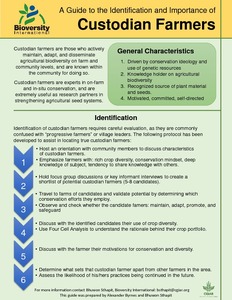 We often talk about custodian farmers; several countries recognized them by facilitating awards and we often interact with them about what they do on their farm? However, some questions remain, “what do we really mean by custodian farmers?", “what are the characteristics of such custodian farmers?”, "what role they for on-farm and in situ conservation projects and beyond?", “what potential roles they can play?” This guide aims to help practitioners to identify and document such farmers in a systematic manner for better understanding and to enable targeted support towards custodian farmers?"